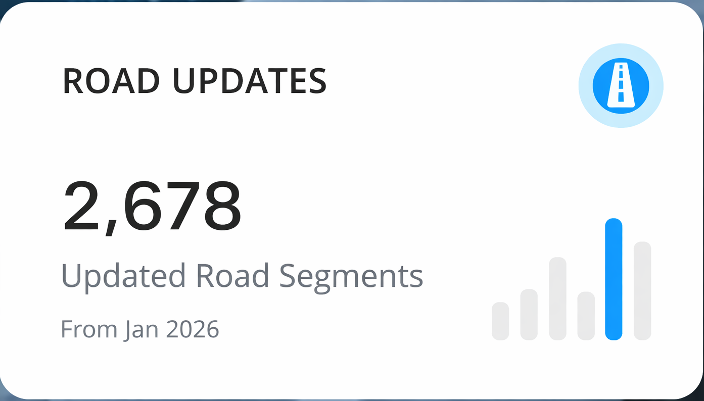 Accurate updates for turn restrictions, speed limits, one-ways, POIs, and road classifications.